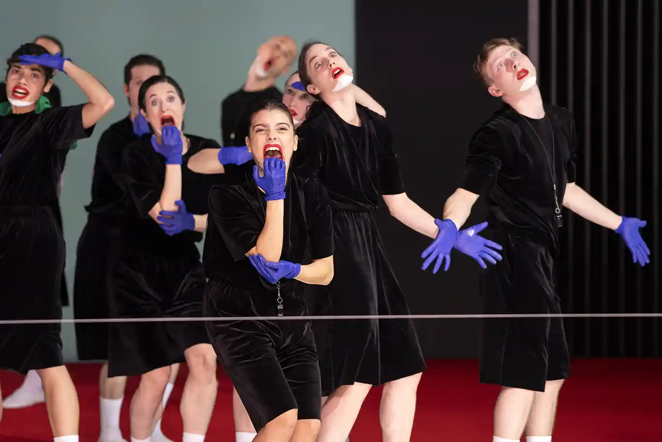 Retour sur le plateau. Durant une heure trente, des interprètes automates aux bouches grimaçantes cernées de rouge, les yeux exorbités vont, à l’unisson et en rythme, en ‘escadrille’ par trois, décliner toutes sortes de pas en déplacements improbables et gestes peu orthodoxes (comme cette longue séance de grattage des parties du corps) de manière mécanique, robotique, tels des pantins soumis à des forces qui les traversent et qu’ils ne maitrisent pas. Le tout dans une succession de tableaux épousant une bande son constituée de chansons de tout style allant de Chico Buarque à la pop de Rihanna, du punk sombre de Joy Division (She Lost Control) à la Symphonie N°5 de Malher.