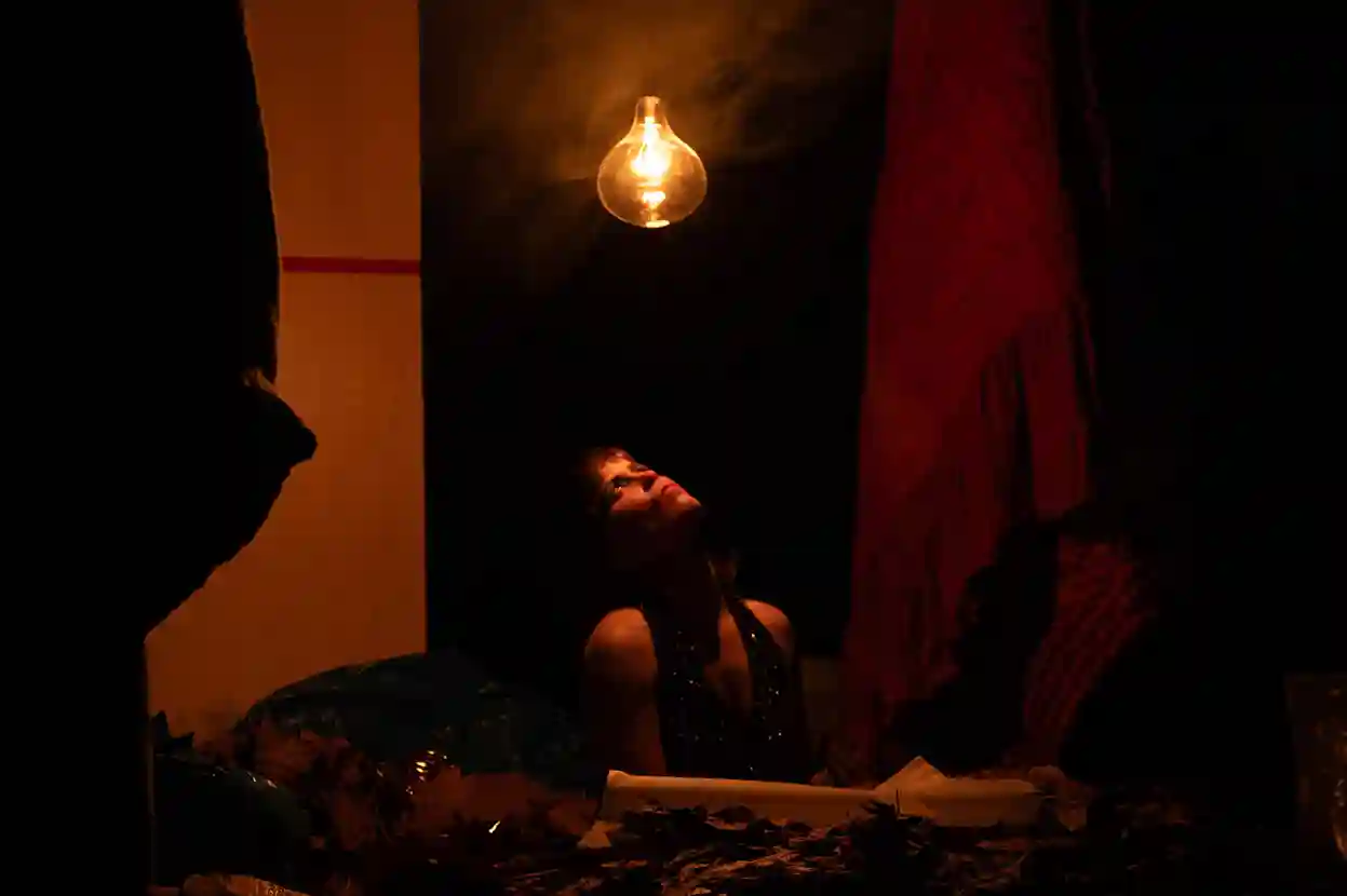 Dans Carne, Audrey Bodiguel met en scène sa propre fin. Entre apparat de diva et dénuement de la chair, elle transforme le plateau en un étrange laboratoire funéraire. Ce solo, d’abord teinté d’humour et d’extravagance, bascule dans une exploration métaphysique de la mort et de la transformation organique.