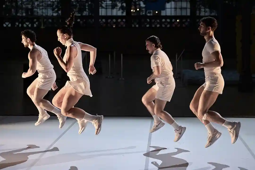 Ce soir-là, c’est un quatuor qui se présente sur le plateau installé dans la grande halle du Carreau du Temple. Trois danseurs et une danseuse se placent à tour de rôle face au public, vêtu.es de blanc comme pour une partie de tennis, short pour les garçon et jupe pour elle. Après un long moment d’immobilité ils entament à l’unisson leurs longs « exercices » de saut, débutant par un sautillement d’un pied sur l’autre. A partir de cette forme simple qui leur permet également de se déplacer, ils et elle prennent peu à peu possession de l’espace selon différentes configurations, directions et regroupements possibles (lignes parallèles, cercles et diagonales, etc).