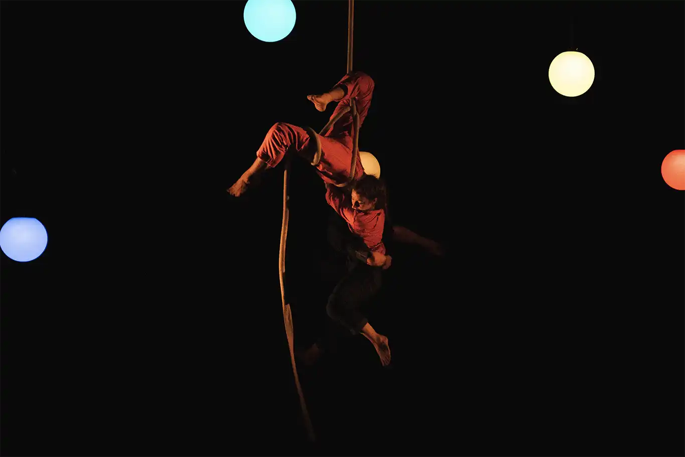 Seuls accessoires présents sur le plateau : une corde qui sert de ‘porte’ d’entrée et de sortie à la pièce et des lampions lumineux, aux couleurs changeantes du plus bel effet, pour éclairer, juste ce qu’il faut, les efforts du duo pour, contre vents et marées, se tenir et rester ensemble là devant nous, durant une cinquantaine de minutes.