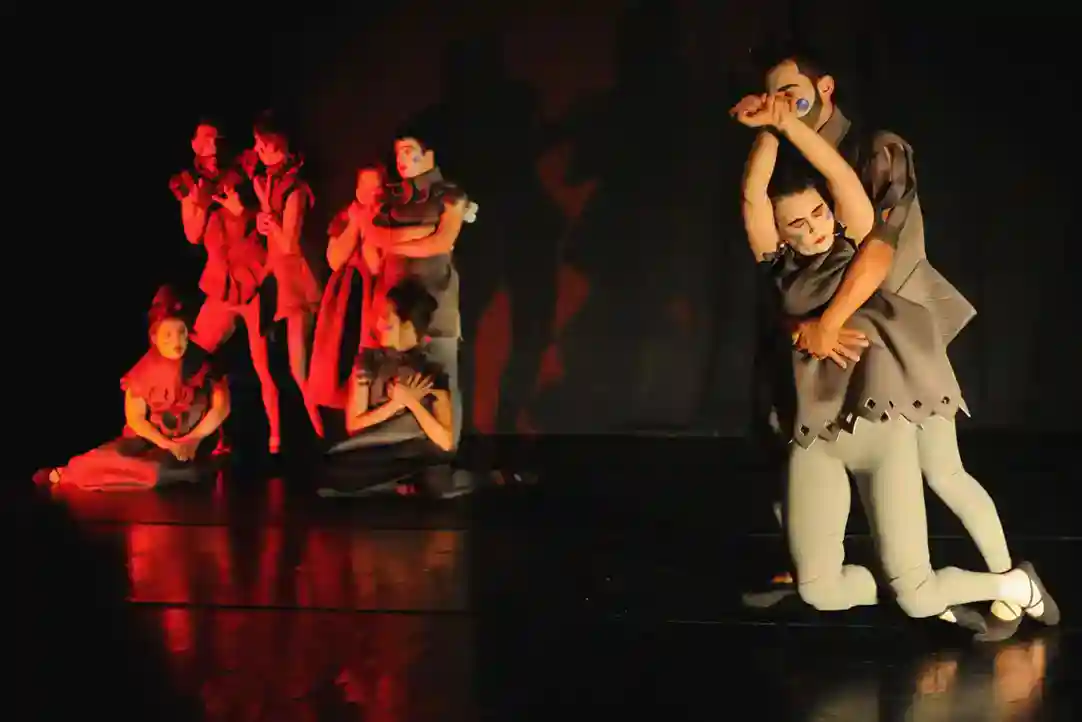 Doesdicon de Tânia Carvalho s’enchaine sans temps mort sur un univers de poupées qui auraient pris vie. Les visages sont maquillés de manière outrancière et les costumes renvoient à un imaginaire lié au Moyen Âge avec collerettes et collants. La première scène est de toute beauté : l’une des interprètes, dont le handicap l’empêche de tenir debout, entre en roulant sur elle-même jusqu’au centre du plateau puis, agenouillée, entame une chanson. Le corps traversé de dyskinésies, l’interprétation qu’elle donne est d’une justesse des plus émouvantes. Les tableaux s’enchainent ensuite à la façon de danses d’automates déréglés. Même si certaines longueurs ne sont pas absentes, Doesdicon est aussi une belle réussite.