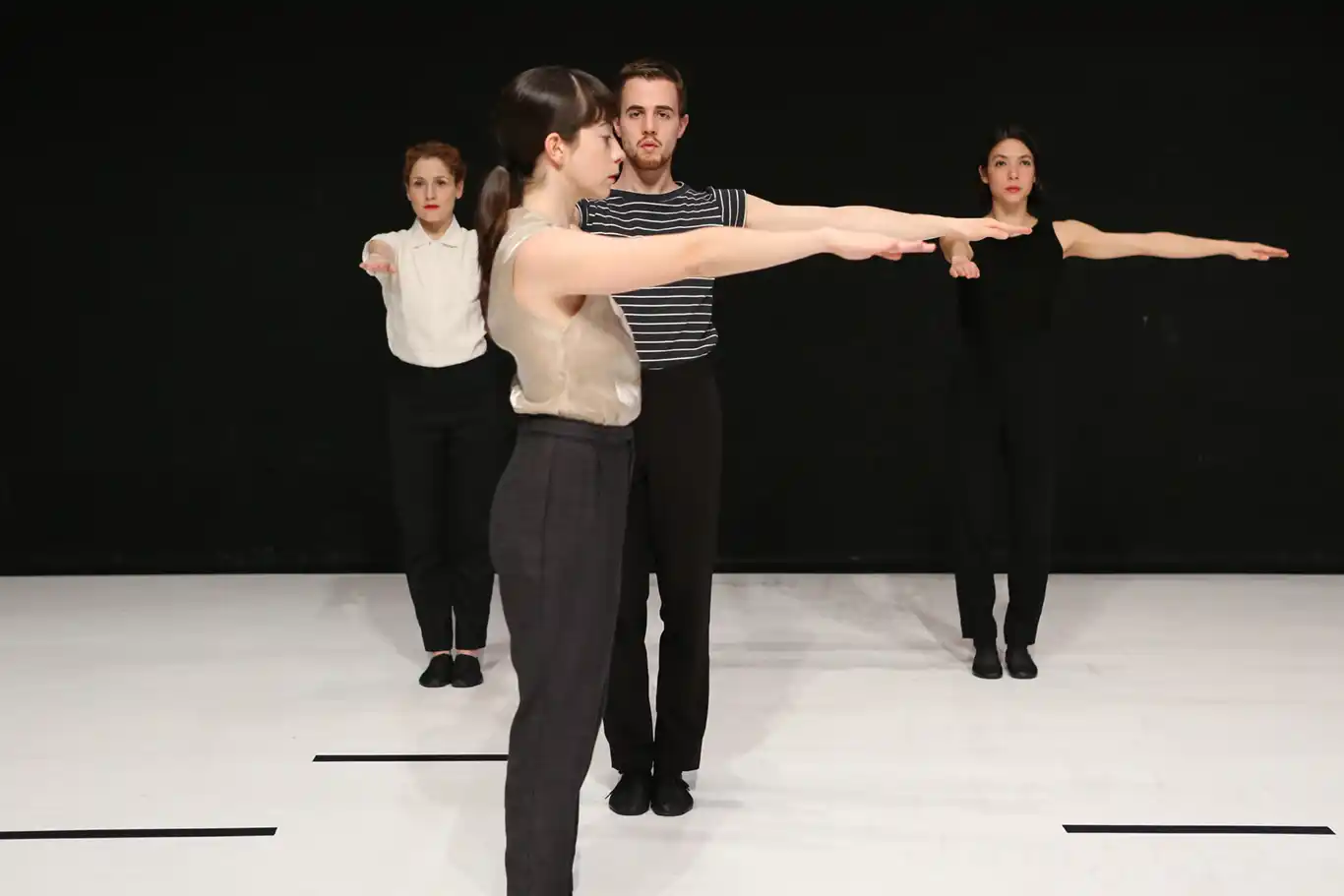 Liz Santoro et Pierre Godard, avec les danseurs de leur compagnie, rejouaient ce soir-là une pièce déjà donnée l’année précédente au même endroit. Ou plus exactement jouaient une nouvelle partition chorégraphique de cette pièce intitulée For Claude Shannon. Ils ont eu la bonne idée pour l’occasion de proposer au public, comme ils l’avaient fait au Centre Pompidou quelques jours auparavant, d’assister à la répétition avant représentation, sachant que la combinaison de gestes qui constitue cette partition est déterminée de manière aléatoire avant chaque représentation. La séance de répétition est donc une séance d’apprentissage et de mémorisation de 8 nouvelles combinaisons (parmi 24) de positions de bras et de jambes à restituer lors de la représentation (c.f. notre article Learning (For Claude Shannon)).