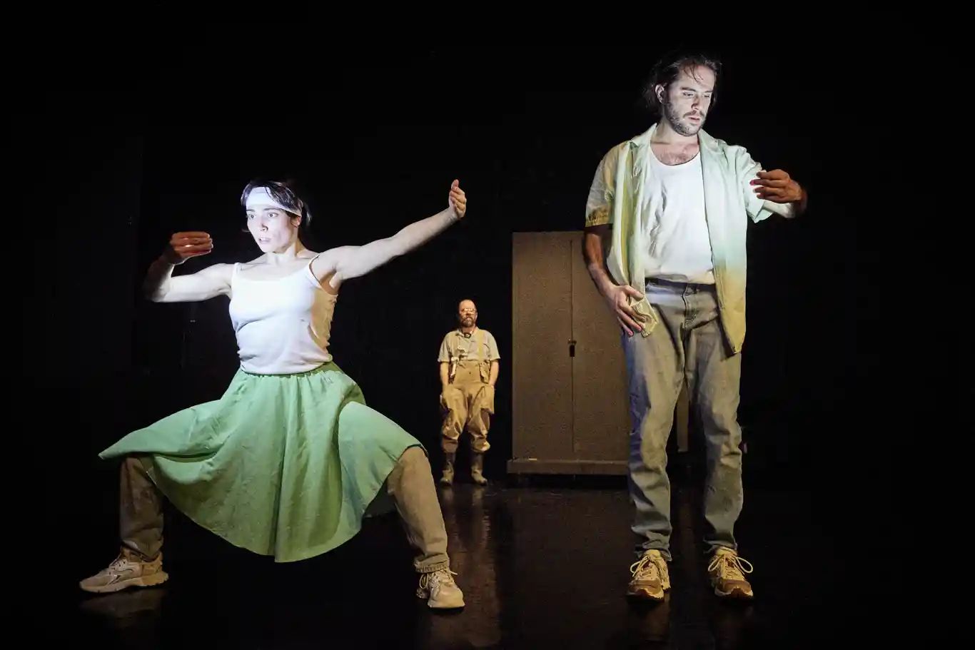 Catherine Dreyfus met en scène ce moment en configurant le plateau comme un théâtre habité par deux petits « homards » : la danseuse Federica Miani qu’on a vu danser avec Gassiel Gaube dans sa pièce Soirée d’études et le danseur Robin Fabre Elissalde. Un troisième personnage, Gianluca Girolami, vêtu comme un marin pêcheur de homard, à la fois narrateur et régisseur plateau, introduit avec la justesse et l’empathie nécessaires au sujet, une pièce qui s’adresse évidemment d’abord, mais pas uniquement, à un jeune public. Cet après midi-là, le Théâtre de l’Étoile du Nord qui programmait I. ou le complexe du homard dans le cadre de son festival Immersion Danse, accueillait plusieurs classes de collégiens qui furent réceptifs à la pièce.