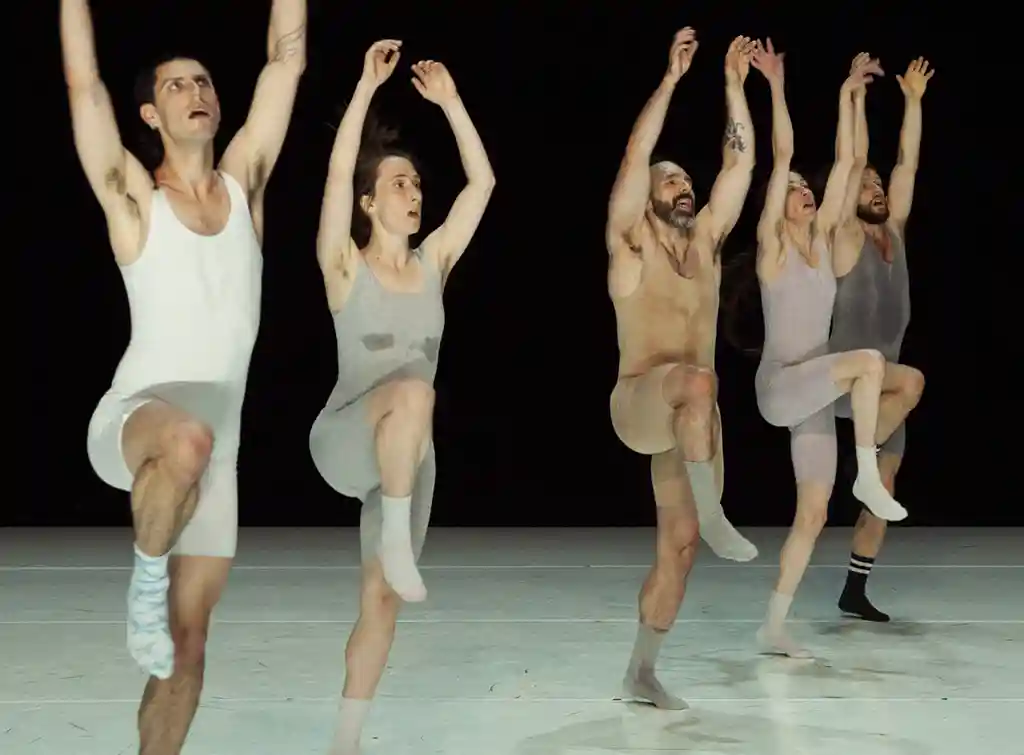 Sur un plateau totalement dépouillé, 2 hommes et 3 femmes vêtu.es de simples justeaucorps comme ceux des lutteurs sportifs et chaussettes aux pieds apparaissent brusquement sortant du noir total, disséminé.es çà et là. Caroline Gravel, l’une des interprètes du quintette débute un mouvement qu’elle répète en boucle durant de longues minutes. Elle plie légèrement les genoux, tend ses deux bras devant elle et recommence. Une petite mélodie de voix se fait entendre au lointain bientôt soutenue par une phrase d’orgue façon années 70 qui n’est pas sans rappeler le Einstein on the Beach de Philip Glass vu récemment. Ici la boucle de quelques notes, qui montent et descendent à l’infini avec quelques variations et accents, va insuffler son caractère hypnotique à la pièce et surtout lui donner un tempo qui ne faiblira jamais.