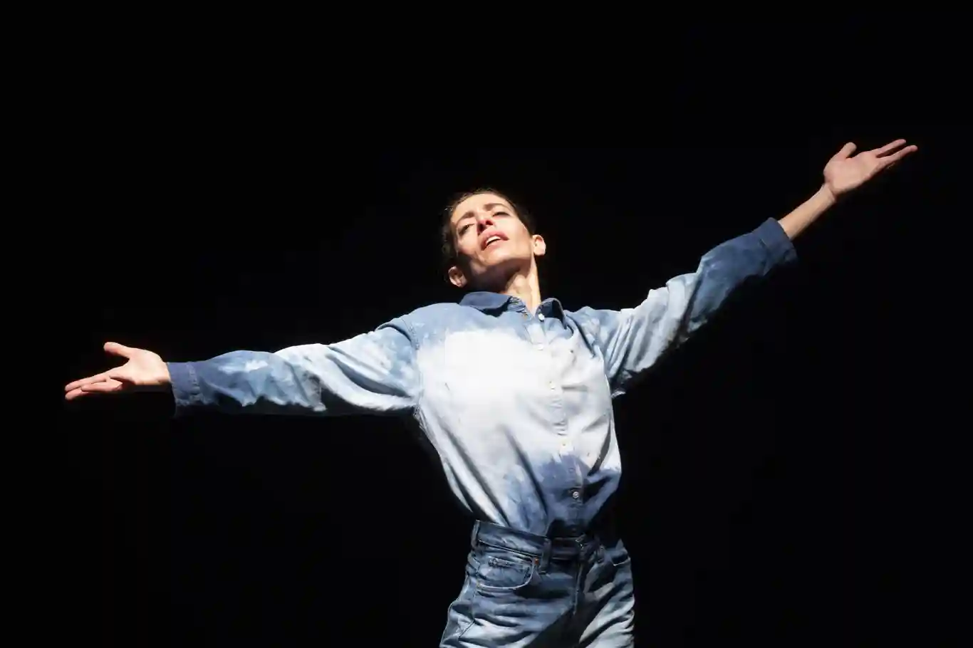 Dans la salle Gémier du théâtre, le plateau habituellement au niveau du sol a laissé place à une scène haute. Une bande son diffuse une boucle dans laquelle on croit percevoir le souffle du vent. Maria Hassabi pénètre sur scène dans une obscurité totale et gagne le centre de l’avant-scène, le proscenium. À peine éclairée par une douche de lumière, elle se tient face au public, les deux mains dans les poches. Vêtue d’un jean et d’une chemise en denim bleu délavé, le corps quasiment immobile, la tête seule s’anime très lentement dans une légère rotation en extension arrière. L’une des mains semble s’enfoncer un peu plus au fond de la poche du jean. La pose initiale se modifie ainsi imperceptiblement.