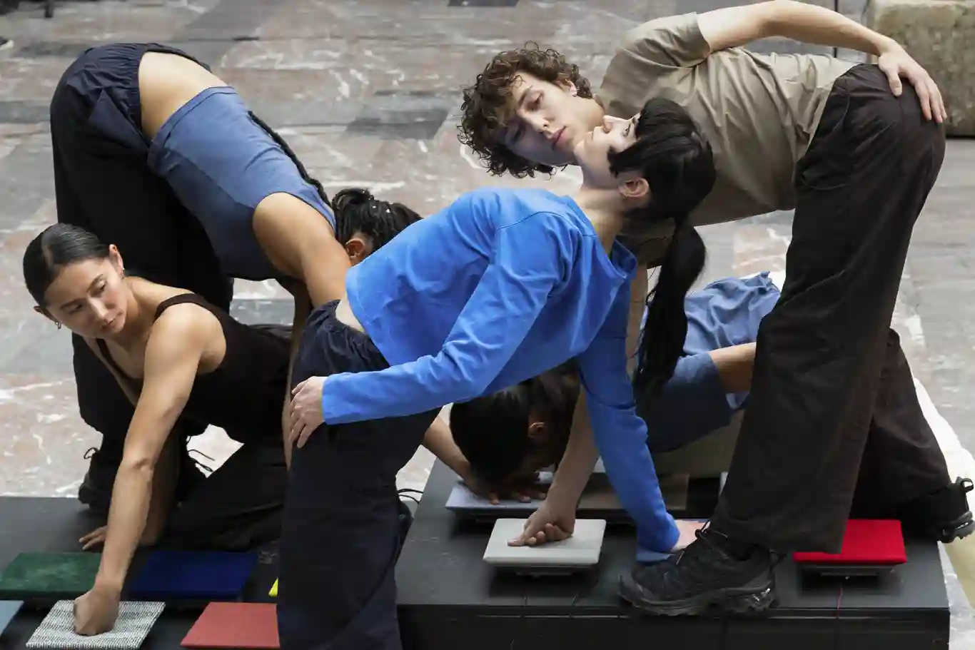 Au fond du studio, alors que le public prend place sur les gradins, praticables, ou plus sommairement sur le sol, l’une des danseuses, Mélisande Tonolo, active déjà l’un des dispositifs sonores constitué de pads. Jouant de toutes les parties de son corps (mains, pieds, genoux, visage), elle génère et module des sons selon le toucher et les pressions qu’elle exerce sur eux. Elle est bientôt rejointe par Stéphanie Amurao, Yumiko Funaya, Nangaline Gomis, Samuel Planas, et Gal Zusmanovitch. Regroupé·es sur ce petit espace, les six interprètes forment de la sorte une sculpture mouvante qui, selon sa configuration et les différentes pressions exercées, sculpte la texture sonore en temps réel dans une infinité de combinaisons.