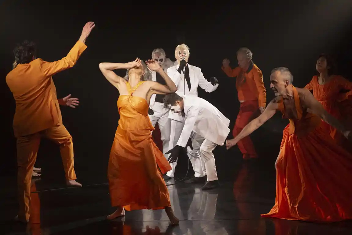 Sur le plateau, cette réunion n’aura rien d’une célébration figée. Trois silhouettes en costumes blancs et aux visages fardés en clowns s’immiscent parmi un groupe de seniors vêtus de rose de la tête aux pieds, immobiles, tels les gardiens de souvenirs en attente de l’étincelle qui leur redonnera vie. C’est Carlotta Sagna qui l’apporte, dissertant avec une ironie mordante sur l’obscurité (« on n’y voit rien, mais il y a beaucoup de rose… ») et la jeunesse. Sortant de leur immobilité le groupe de séniors quitte le plateau.