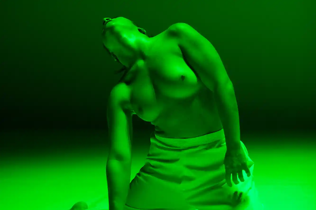 Marie-Philippe Santerre est au plateau, le torse nu. Une nudité qui dévoile toute la matière du corps ‘en travail’. Elle ondule du bassin jusqu’au crâne. Tout d’abord dans une position de 3/4, le torse tourne presque imperceptiblement pour se trouver face public, puis poursuit sa course lente. Le souffle est de plus en plus audible et gagne en intensité sonore à mesure que le mouvement se développe et se transforme.