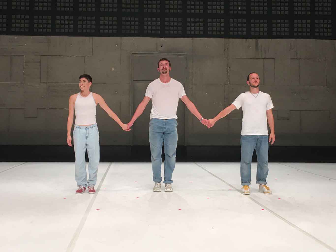 Dans un style vestimentaire « urbain » (jean, basket, teeshirt blanc ce soir là), Cassiel Gaube, Federica Miani et Diego Dolciami enchainent, avec l’entrée ou la sortie de l’un.e ou de l’autre du plateau, duos ou trios à l’unisson sous la forme de courtes pièces, ces fameuses études, qui se succèdent naturellement par un phénomène de contagion et de transformation.