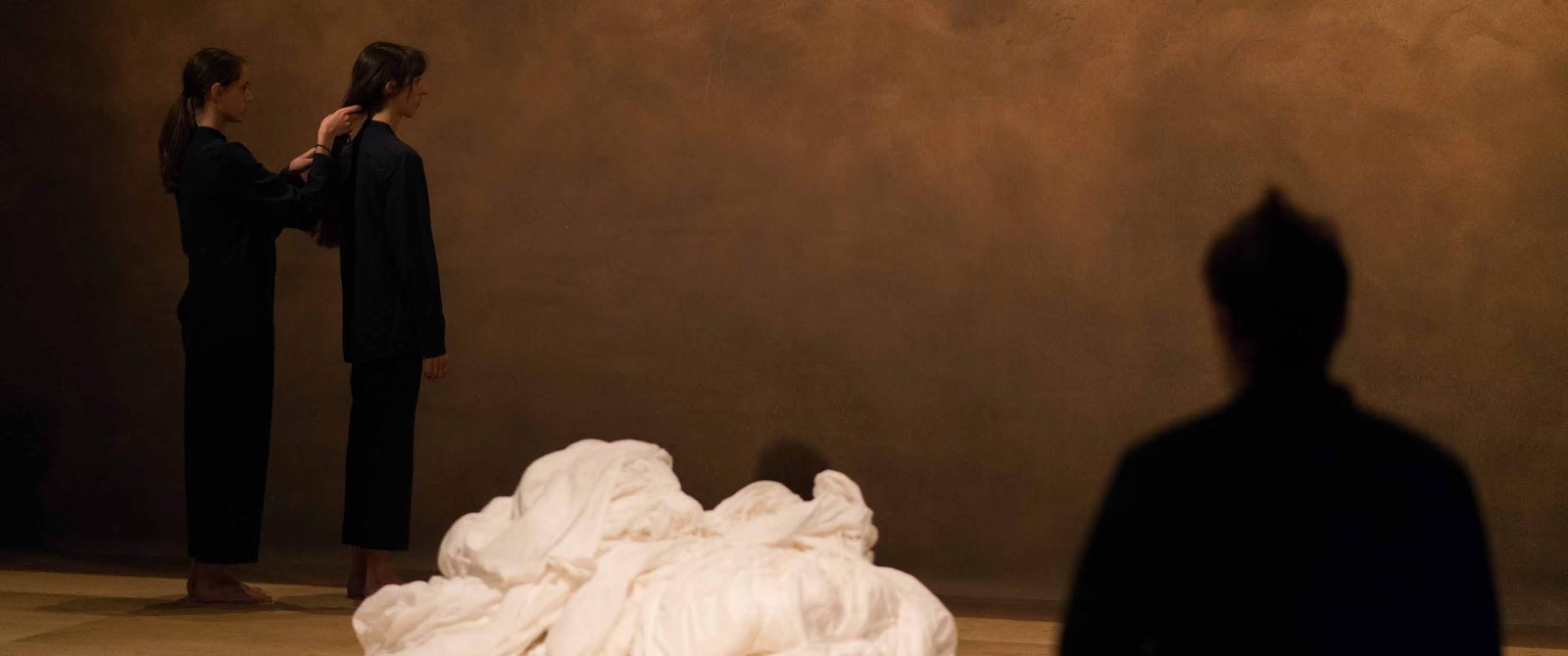 Dans un 2ᵉ tableau, le décor blanc va disparaître et laisser place à des murs peints sombres. C’est sans doute là qu’il faut voir l’inspiration que constitue pour la chorégraphe le peintre Michaël Borremans, dans ces couleurs de terre du décor et dans une trame figurative : ici les six danseurs ne font plus corps ensemble, et deviennent des figures isolées à l’image des personnages peints de Borremans. On remarque le beau duo de deux des danseuses qui partant d’un léger signe de la main développent peu à peu une gestuelle plus ample et abstraite, affirmant une géométrie de lignes et de larges déplacements dans l’espace.