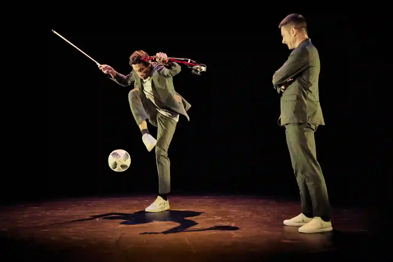 Violon et ballon deviennent les extensions de leurs corps en mouvement, et pizzicato et glissando trouvent leurs équivalents dans le maniement du ballon qui glisse des pieds à la tête, passe par les épaules, rebondi sur le dos et au creux de la nuque. Gabriel Majou et Paul Molina dessinent leur pas de deux avec précision sur le plateau. Pour autant, la pièce repose sur une écriture chorégraphique qui assume pleinement sa dimension ludique.