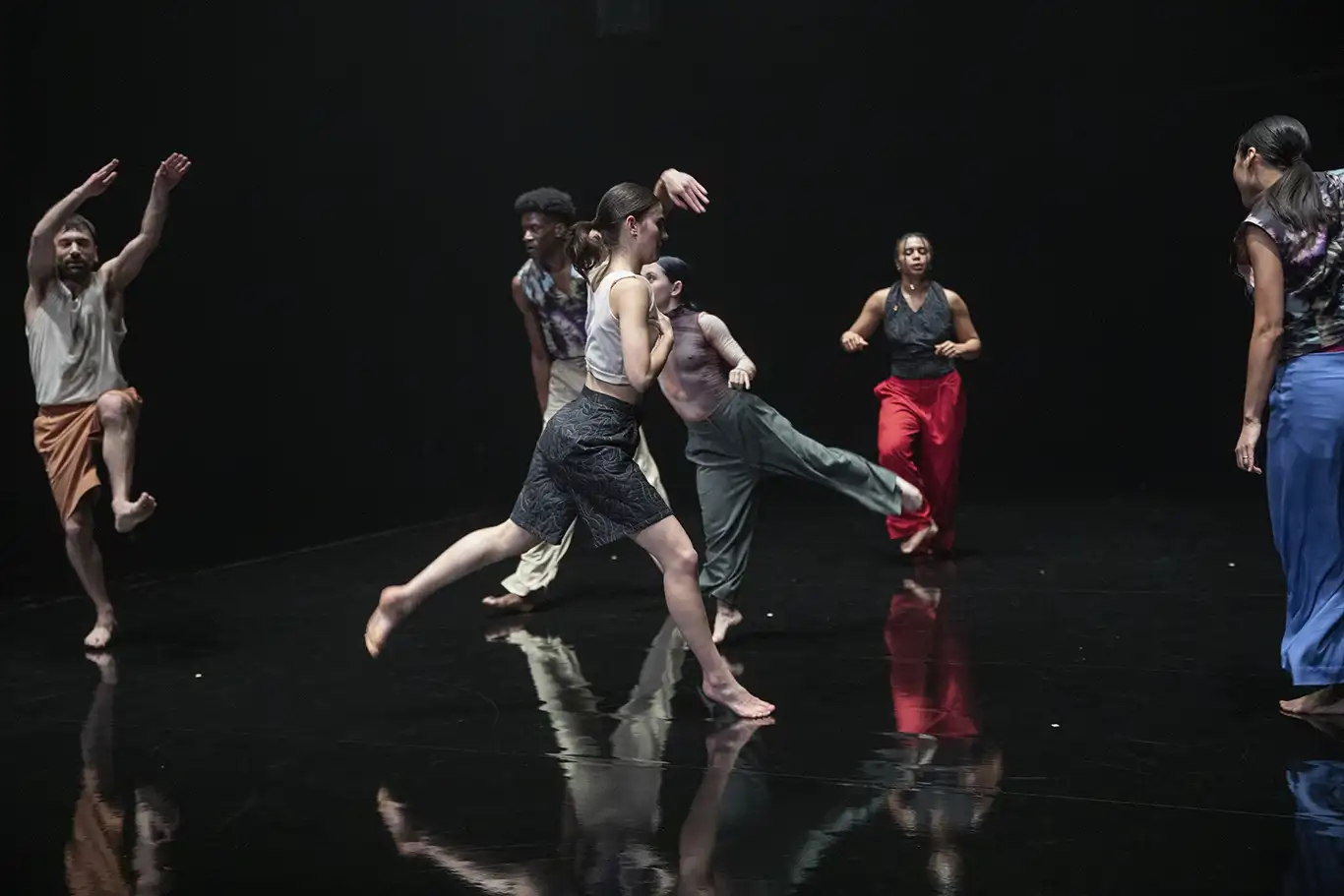 La danse procède souvent par répétitions, accumulations et transformations de gestes. Les mouvements des corps épousent les vocalises d’une large variété de styles musicaux puisqu’on y entend du jazz, de la pop, de la musique indienne, de l’électro, du funk et même une version de Bella ciao sul femminicidio repris en chœur par l’ensemble des interprètes. Les dynamiques des compositions sont de fait aussi très différentes les unes des autres, et les interprètes semblent jouir d’une grande liberté dans des propositions de danse toujours très personnelles. Comme dans ce tableau final (qui paraît) improvisé sur la composition éthérée Sol Lucet du Trio Mediæval, où ils/elles se retrouvent à danser ensemble jusqu’à un fondu au noir. Cette liberté chorégraphique est proprement réjouissante à observer.